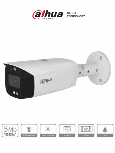 DAHUA DH-IPC-HFW3549T1-ZAS-PV – Cámara IP bullet de 5 MP /WizSense/ Lente varifocal/ TIOC 2.01/ Disuasión activa/ Iluminador dual inteligente/ IR 50 m/ Luz cálida 40 m / SMD 4.0 / Audio bidireccional / E&S de alarma y audio/ PoE/ IP67/