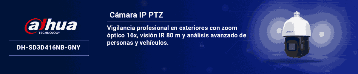 La cámara DH-SD3D416NB-GNY es una cámara IP PTZ de la serie WizSense diseñada para monitoreo exterior profesional. Integra un sensor CMOS de 1/2.8″ con resolución de 4 MP, zoom óptico de 16x y tecnología Starlight para obtener imágenes claras incluso con baja iluminación. Su alcance IR de 80 m y protección IP66 garantizan un desempeño confiable en entornos exigentes. Ofrece funciones inteligentes como IVS, SMD 3.0 y seguimiento automático, que permiten detectar y clasificar personas o vehículos con alta precisión. Compatible con PoE+ y protocolos ONVIF, es una solución flexible y eficiente para seguridad avanzada.