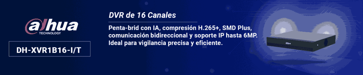 El grabador DH-XVR1B16-I/T pertenece a la serie WizSense Cooper, diseñada para soluciones de videovigilancia económicas y confiables. Con 16 canales penta-brid (HDCVI, AHD, TVI, CVBS e IP), soporta cámaras IP hasta 6MP y cuenta con inteligencia artificial para detección precisa de personas y vehículos. Su codificación H.265+ optimiza el uso del ancho de banda y almacenamiento, mientras que la comunicación bidireccional permite interacción directa con las cámaras. Compatible con plataformas móviles DMSS y Dolynk, esta grabadora es ideal para negocios o residencias que buscan seguridad eficiente, inteligente y fácil de administrar.