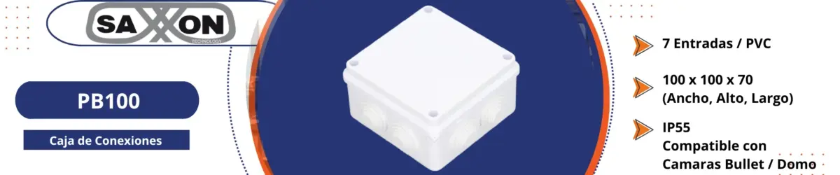 La SAXXON PB100 es una caja de conexiones impermeable, diseñada para facilitar la instalación de cámaras de videovigilancia como Bullet o Domo. Fabricada en material ABS de alto rendimiento y PVC libre de halógenos, ofrece una solución segura, duradera y estética para alojar conexiones eléctricas y de video en ambientes interiores o exteriores.
