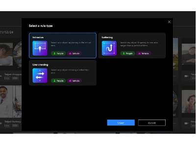 La búsqueda de escena permite a los usuarios buscar imágenes de video de una cámara específica mediante detección de cruce de línea, detección de intrusión o detección de merodeo.